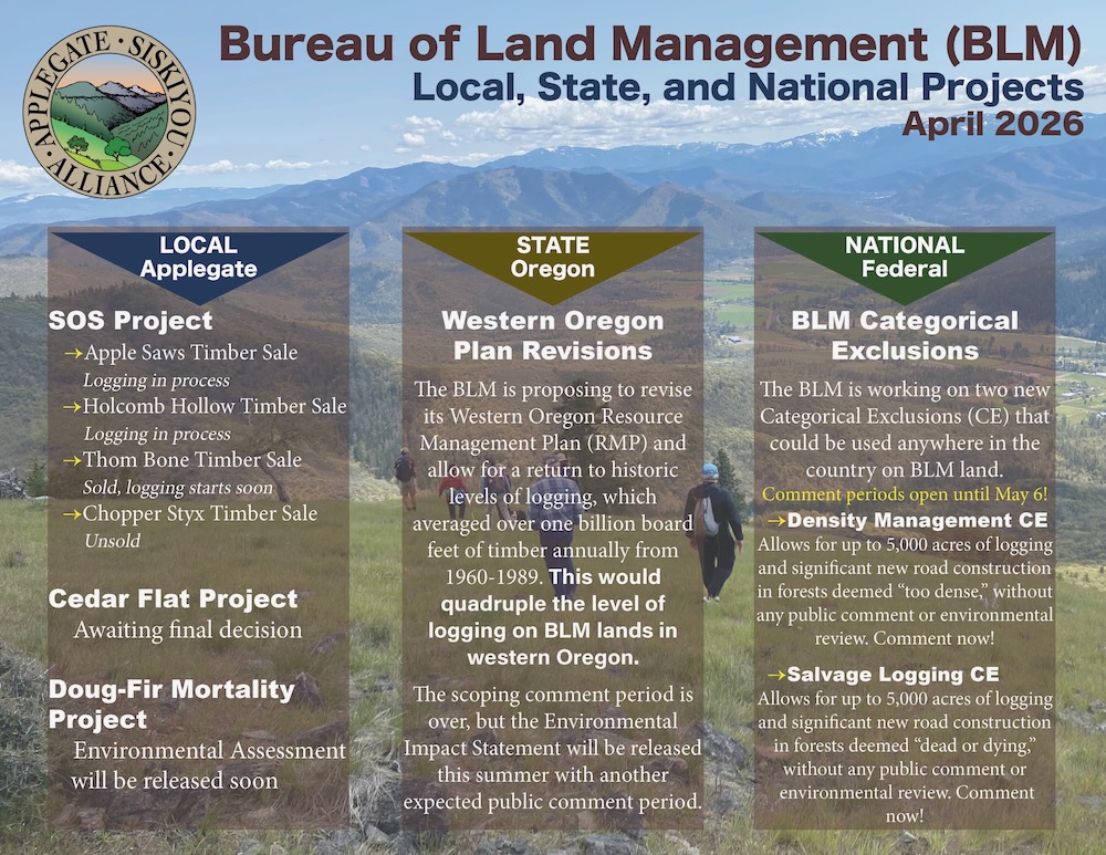 In this process, the BLM would no longer conduct or allow for public comment; they would no longer analyze the potential impact of project activities, and they would no longer disclose to the public what the impact of these management activities might be. Instead, the process is designed specifically by the BLM to rubber-stamp damaging BLM timber sale activities and fast-track large-scale logging projects on forested BLM lands throughout the country, including western Oregon and the Applegate River watershed.
