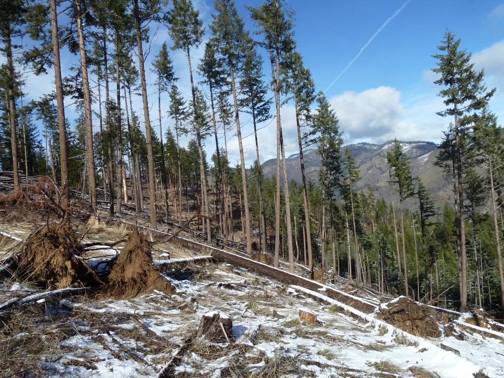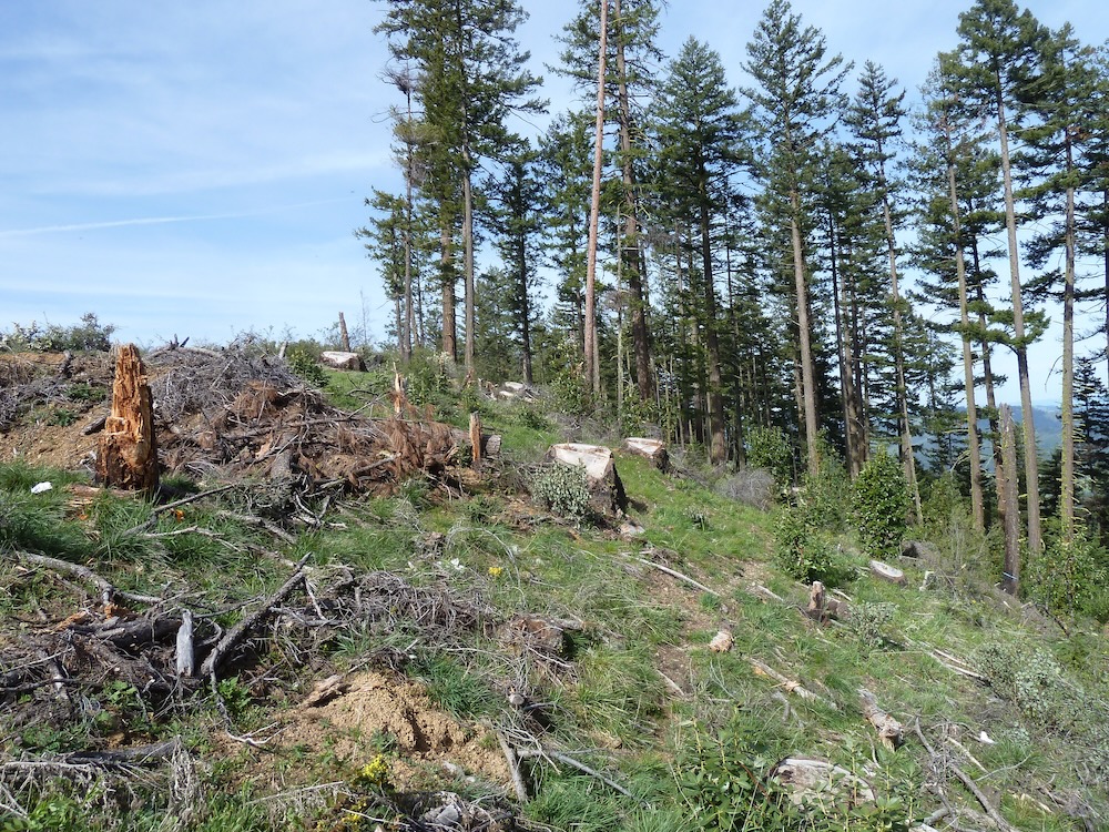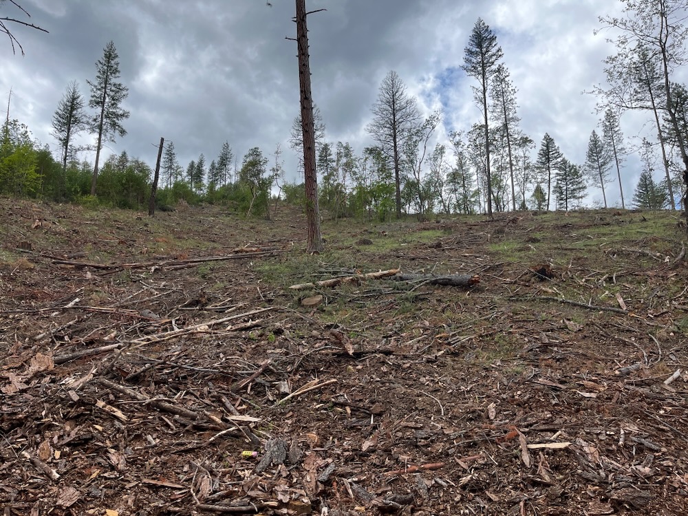 Conditions following commercial thinning in the O’Lickety Timber Sale in the Little Applegate Valley. Following the heavy thinning operations windthrow was significant and further reduced canopy cover and impacted northern spotted owl habitats.