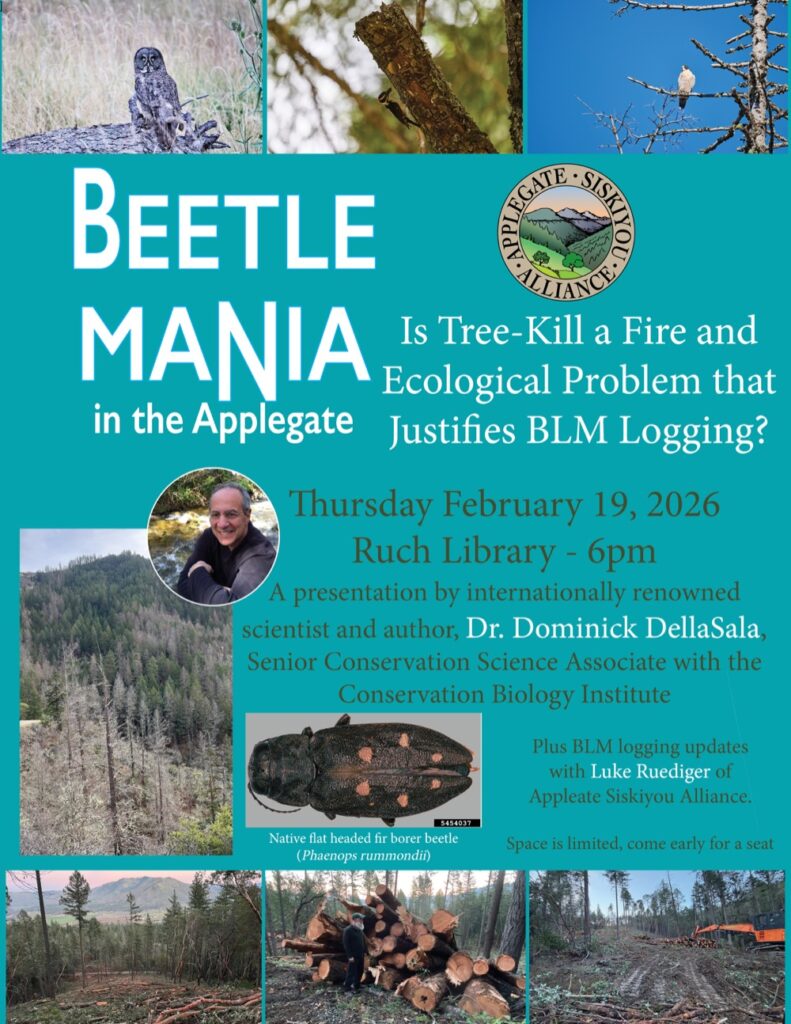 Native beetles, such as the flat headed fir borer beetle have experienced episodic population booms in the forests of southwest Oregon. Although often maligned, these beetles are forest architects and their effects have ecological significance. The flat headed fir borer beetle has killed many Douglas-fir trees in the Applegate at lower elevations in recent years, predominantly in the drier, eastern portions of the watershed, and in more arid plant communities. BLM is now pushing to not only “salvage” log the dead standing snags that are important for wildlife, but also to log living green trees in response to the beetle kill, creating more cumulative mortality in treated stands than in other portions of the landscape. Dr. Dominick DellaSala will discuss native beetles as forest architects, their ecological role in forest ecosystems, and the often dampening affect of gray and late stage beetle mortality on both stand and landscape level fire risks.
