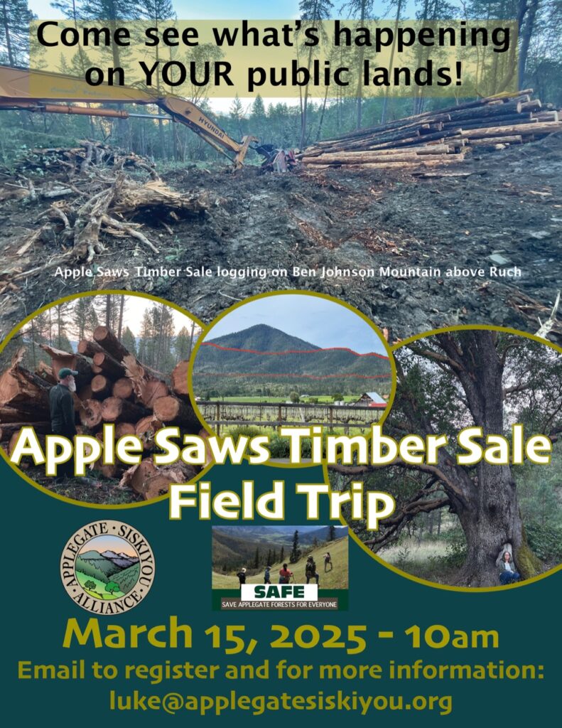 Luke Ruediger from Applegate Siskiyou Alliance will also give an update on the current BLM salvage logging happening in the Applegate, including the Apple Saws Timber Sale and Holcomb Hollow Timber sale, as well as the upcoming Douglas-fir Mortality Complex and Cedar Flat Projects.